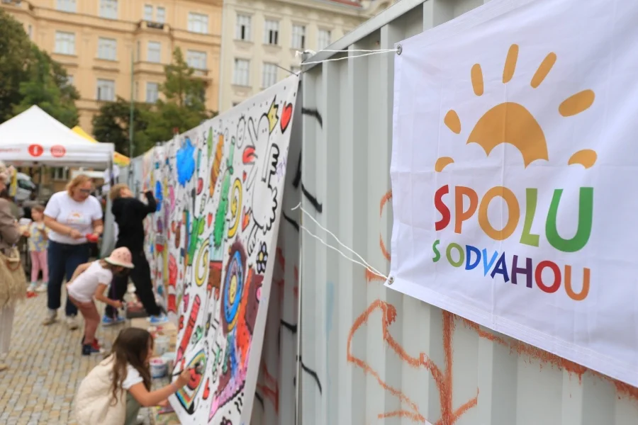 Na Jiřáku se na den objevila zeď, kterou si děti mohly ve středu 10. září pokreslit a zapojit se tak do tvůrčích aktivit se stánkem nadačního fondu Spolu s odvahou Česká republika.