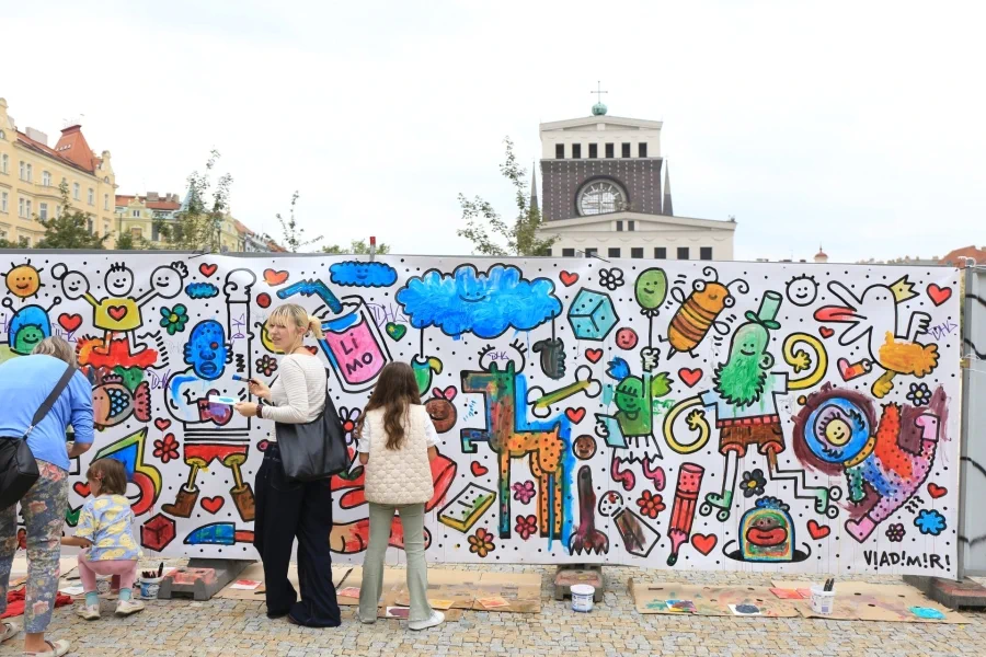 Už ve 14.00 se mohli všichni kolemjdoucí zapojit do streetartového workshopu s ilustrátorem Vladimírem Strejčkem přímo na náměstí Jiřího z Poděbrad. Kromě hlavní výtvarné zdi tu celý den probíhaly i menší výtvarné aktivity.
