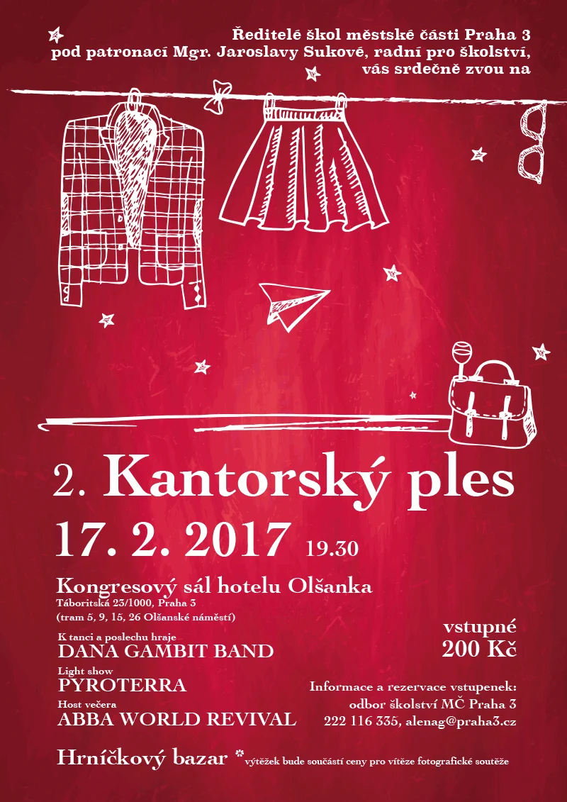 Ředitelé škol městské části Praha 3 pod patronací Mgr. Jaroslavy Sukové, radní pro školství, vás srdečně zvou 17. února do hotelu Olšanka na již druhý Kantorský ples.