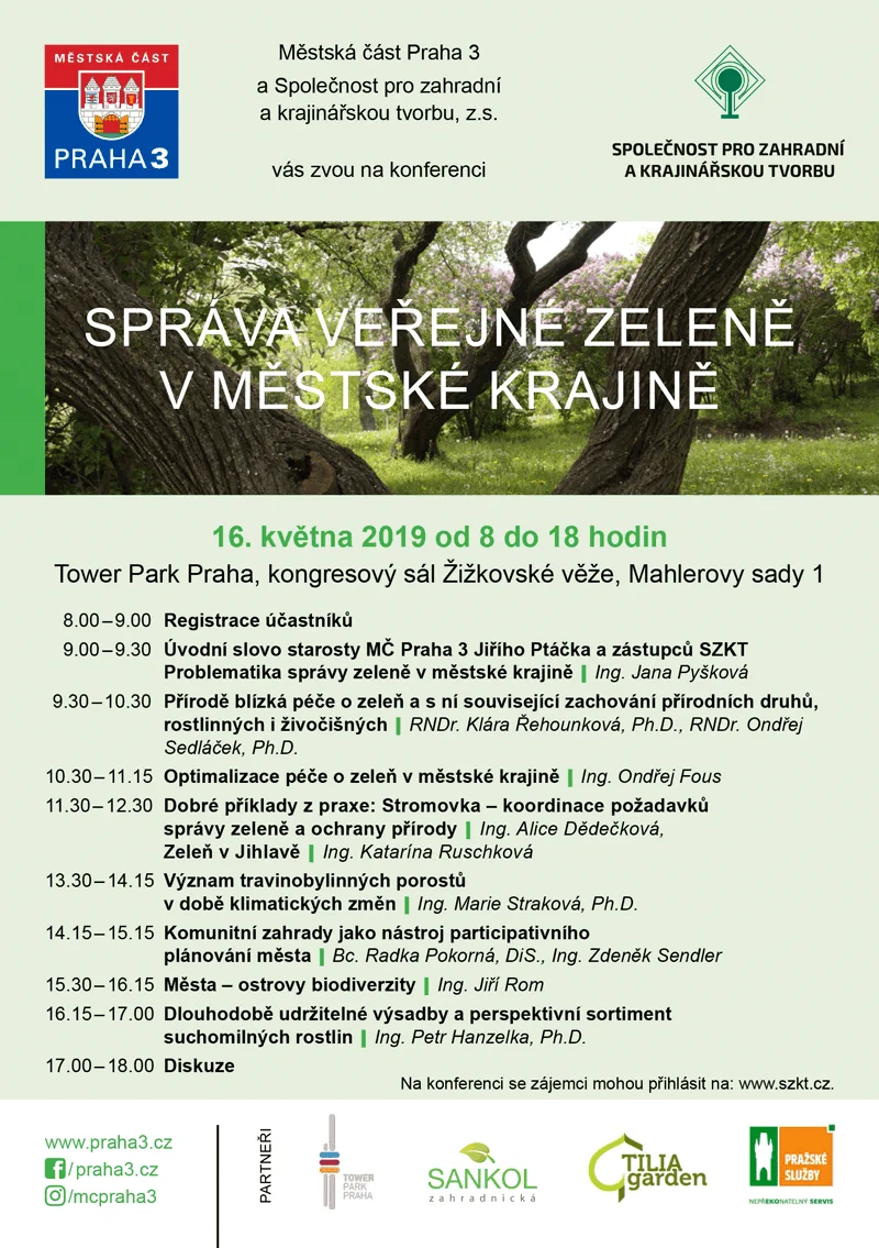 Městská část Praha 3 ve spolupráci se Společností pro zahradní a krajinářskou tvorbu, z.s. pořádají 16. května 2019 konferenci „Správa veřejné zeleně v městské krajině“. Akce se koná v kongresovém sále Žižkovské věže, Tower Park Praha, od 8 do 18 hodin a zájemci o účast se mohou přihlásit na: Více informací ZDE.