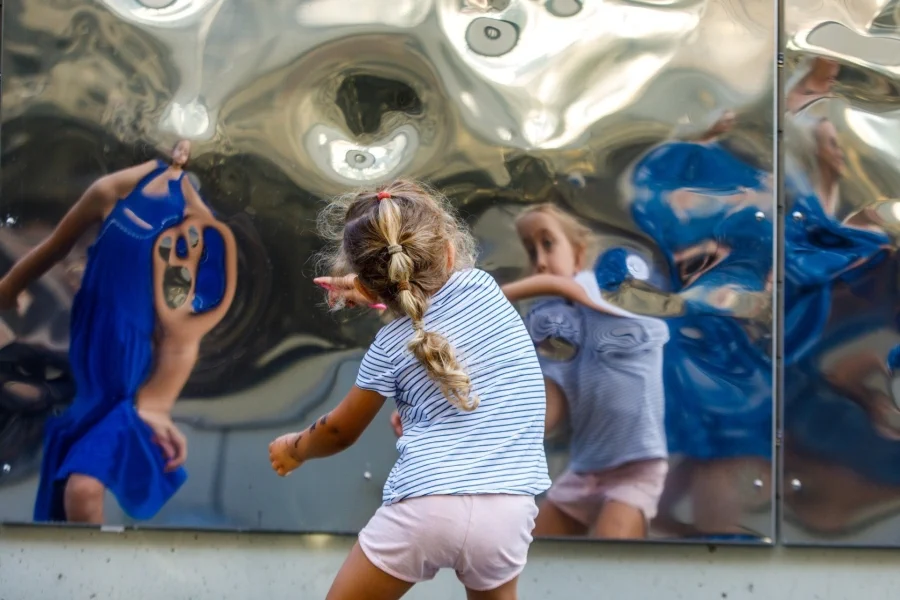 Autorem návrhu a samotného uměleckého díla je Vít Šimek z Atelieru HRA, který na jeho vzniku spolupracoval s Karolínou Hausenblasovou. Jak vyplývá z názvu, koncept pracuje se zrcadly, respektive nerezovými leštěnými plechy. Ty budou při vstupu do tunelu, stejně jako při výstupu z něj na Tachovské náměstí vytvářet zajímavou hru světel. „Naším cílem bylo vytvořit permanentní, interaktivní uměleckého dílo, které se stane součástí veřejného prostoru Tachovského náměstí. Zrcadlové stěny dostávají do jinak poměrně úzkého koridoru klesajícího k tunelu více světla, prostoru a dynamiky. Dílo interaguje s člověkem přicházejícím z Karlína stejně tak jako s chodcem či cyklistou přijíždějícím z opačného směru,” upřesnil svůj původní umělecký záměr Vít Šimek.