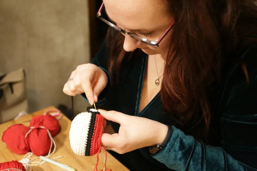 Během háčkování si spolu všechny povídáme a kolují i fotky toho, co si kdo doma už uháčkoval. Kamila právě ukazuje třináctileté slečně, jak má vytvořit květinovou gumičku do vlasů. Zdeňka se pouští do háčkování čepičky pro miminko. Báře se v rukách rýsuje pokeball, který by určitě brali všichni milovníci pokémonů. „Dělám ho na swap pro jednu paní. Řekla si o něj na facebooku. Když chce někdo něco uháčkovat, nabídnu se a hotový výrobek pak vyměním za věc, která se mi hodí,“ vysvětluje. Marlena, další účastnice naší komorní sešlosti, přijela na Žižkov až z Horních Počernic, kde bydlí. Dozvídáme se od ní třeba to, že lehké šaty, které si uháčkovala na léto tak, aby je mohla nosit přes plavky, jí zabraly deset dní.
