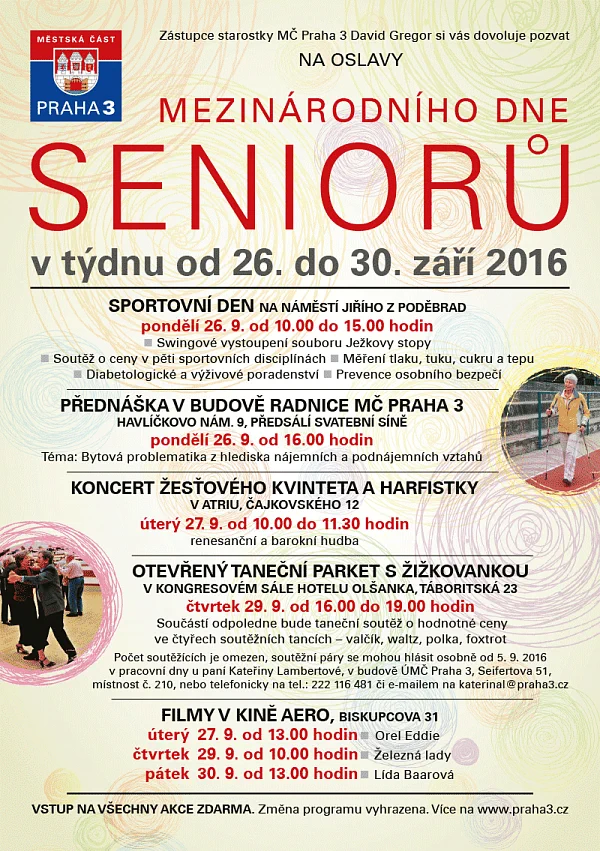 „Oslavy mezinárodního dne seniorů se už na Praze 3 staly tradicí. Jsem rád, že se akce vryla do srdce seniorů, o čemž svědčí jejich každoroční vysoká účast. A nejen jich. Některé akce navštíví i mnoho dalších obyvatel Žižkova a jeho okolí. Věřím, že letošní program opět zaujme,“ říká zástupce starostky David Gregor, který má na starosti sociální oblast. Městská část Praha 3 tentokrát pro seniory připravila akce, při kterých se mohou aktivně vyžít, získat nové zážitky a zkušenosti a ti osamělí se mohou seznámit. Program je rozdělen na Sportovní den na náměstí Jiřího z Poděbrad, který se koná 26. září od 10.00 do 15 hodin, a na Taneční odpoledne pro seniory v Kongresovém sálu hotelu Olšanka, které proběhne ve čtvrtek 29. září od 16.00 do 19.00 hodin.