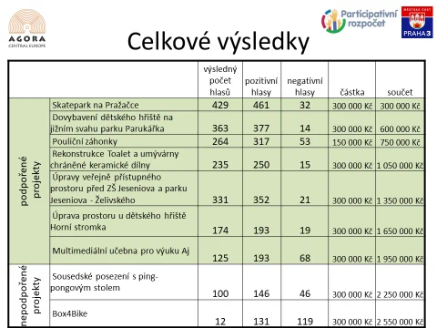 Hlasování probíhalo od 1. 6. do 30. 6. a zapojila se do něj především střední generace mezi 25 – 44 lety žijící na Žižkově. Městská část Praha 3 podpoří vybudování skateparku na Pražačce, dovybavení dětského hřiště pítkem a mobilní toaletou na jižním svahu parku Parukářka. Bude se rekonstruovat toaleta a umývárna chráněné keramické dílny nebo se upraví zeleň před ZŠ Jeseniova nebo i prostor u dětského hřiště Horní Stromka. V základní škole na nám. Jiřího z Lobkovic bude vytvořena multimediální učebna anglického jazyka.