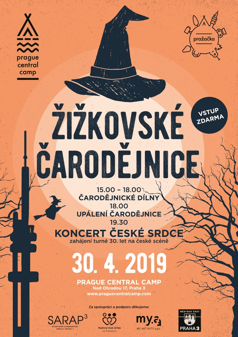 V areálu Prague Central Camp (Nad ohradou 17, Praha 3) se letos čarodějnice sletí ze všech koutů Prahy 3. Na malé i velké návštěvníky čeká 30. dubna od 15:00 hodin odpoledne plné zábavy. Vstup na akci je zdarma.