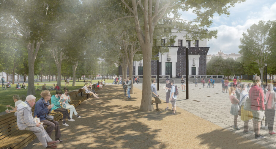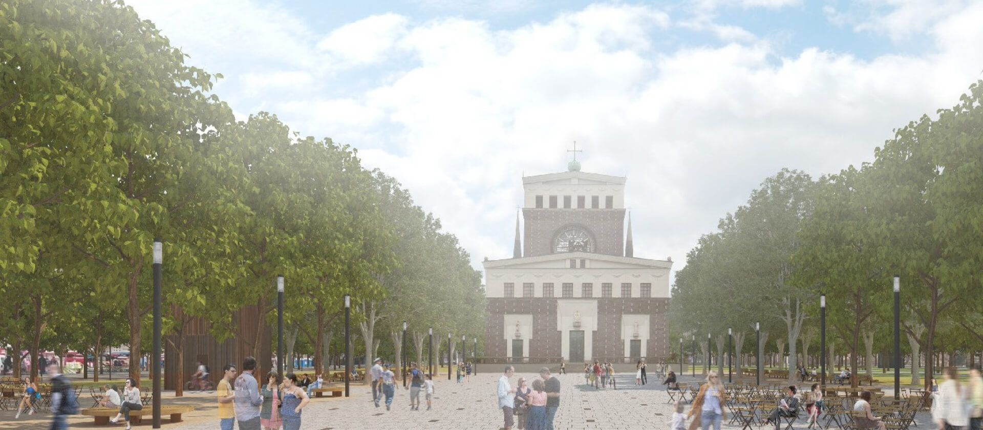 Návrh obnovy náměstí zachovává charakter místa jako městského parku s velkým podílem zeleně. Před kostelem bude v podélné ose vytvořeno menší „náměstí“ jako rozšíření prostoru pro veřejné akce. Tuto dlážděnou plochu budou lemovat podélné aleje platanů.
