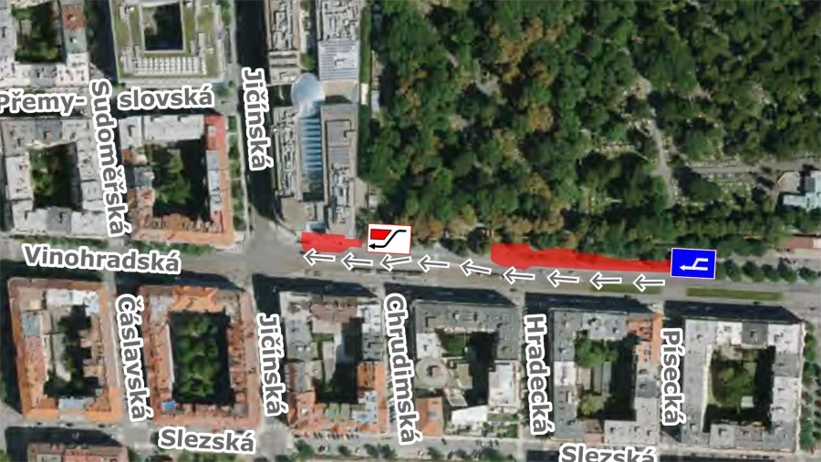 Vinohradská ulice v úseku Chrudimská — Jičínská (snížení počtu jízdních pruhů v uvedeném směru)
