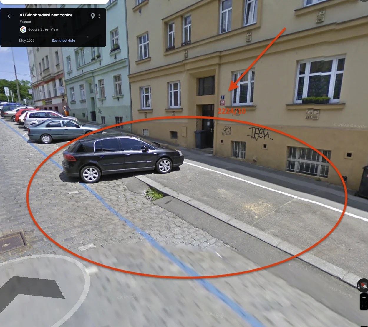 dostupná stavební dokumentace, obsahující účel komunikace a jeho případné změny v dostupném historickém průběhu, vč. dodatečně zřízené tzv. modré zóny (která je na části místní komunikace, a částečně na bývalém chodníku pro pěší), pro projekt jako celek, vč. obsažení detailu / výkresové dokumentace zejména pro podobu komunikace v místě před domem 2224/10 téže ulice (viz foto).